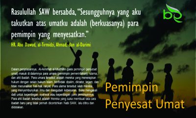 Rasulullah SAW bersabda, “Sesungguhnya yang aku takutkan atas umatku adalah (berkuasanya) para pemimpin yang menyesatkan.” HR. Abu Dawud, al-Tirmidzi, Ahmad, dan al-Darimi Dalam penjelasannya, Al-Aimmah al-Mudhillin...